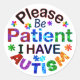 The message of “Please Be Patient I Have AUTISM” to understand and respect people with Autism and encourage kindness towards them.