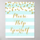 Please help yourself bar or dessert table sign poster for baby shower, bridal shower, or wedding in light baby blue and white stripes pattern with gold confetti, please note gold glitter is photographic effect only. Perfect for a baby shower, wedding, or bridal shower.