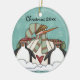 Snowmen and penguins with a teal sky and soft snowflakes falling with an area you can personalise with the current year on a porcelain keepsake ornament you're sure to treasure for years to come.