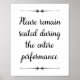 This charming print features the phrase "Please remain seated during the entire performance" in a handwritten black font and accented on top and bottom. This is a humourous way to decorate a bathroom or washroom.