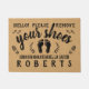 "Hello! Please Remove Your Shoes" text with feet, shoes and laurel sprigs. Add your family name to this chic rustic farmhouse doormat with a faux burlap background and black silhouettes - perfect for lovers of the farm look.