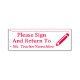 This traditional rubber stamp design features the message "Please Sign And Return To", along with a line that a signature or initials could be written above. It also features a personalised name. It could perhaps be be used by a teacher, tutor or educator to ask a student’s parent(s) or guardian(s) to review and acknowledge the mark that a student got on a project, a test, a quiz, a paper, or some other school assignment.