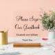 Please sign our guestbook is an elegant black script. The other text is not in a script. The other text is for the names of the bride and groom and a custom message such as Thank You. All text can be edited or deleted.