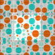 A plethora of orange and light blue circles in a mesmerising mid-century modern composition. Retro-inspired circular patterns.