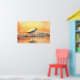 Vivid watercolor illustration of a bird standing on a sandy beach, with gentle ocean waves and glowing sunset hues creating a tranquil and painterly atmosphere.