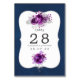 Dark plum purple roses and silver glitter tropical foliage wedding table number cards with a navy blue watercolor wash backgound.