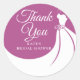 Plum and white elegant gown bridal shower, thank you classic round sticker featuring an elegant wedding gown on a plum background with a beautiful white script text with your special bridal shower details personalised in chic text. You can customise the background colour to coordinate with your wedding theme.
