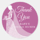 Plum and white elegant lace gown bridal shower thank you, classic round sticker featuring a bride wearing an elegant lace wedding gown on a plum background with a beautiful script white text for your special bridal shower details. You can customise the background colour to coordinate with your wedding theme.