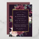 Chic floral bat mitzvah invitation features a border of burgundy marsala purple, blush pink, and dusty blue flowers, with lush botanical foliage and greenery and gold foil trim. Personalise with your temple ceremony and celebration details in modern lettering on a rich charcoal background.