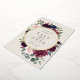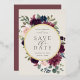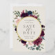 Our Plum Blossom wedding save the date frames your wedding details with an elegant square border of lush watercolor foliage and flowers in blush pink, burgundy plum purple and dark dusty blue, with real gold foil trim on a vintage ivory background.