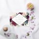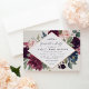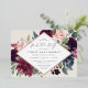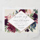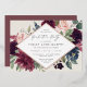 Elegant floral graduation party invitation features a diamond shaped frame of watercolor flowers and foliage in burgundy, purple, dusty rose, blush pink, dusty blue, and dark sage green, and finished with rose gold foil trim. Personalise with your graduation party details.