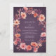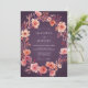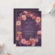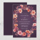 A charming wreath of peach and coral blossoms adorns this design. Delicate floral elements create a romantic, painterly feel with a deep plum backdrop. Evokes a warm, ethereal atmosphere for a special occasion.