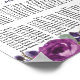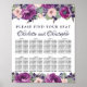 Deep plum roses, blush pink flowers and lots of deep purple wildflowers create beautiful top and bottom borders on this 8-Table seating chart. There is lots of greenery and leaves and dangles. Please find your seat is written in a bold serif font. The wedding couple names are written in a beautiful script font.