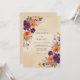 This design features a rich palette of deep plum and burnt orange blooms set against a soft cream watercolor background. Dark purple anemones and terracotta roses are accented by delicate sage green and dusty lavender foliage. This botanical artwork evokes a moody, organic atmosphere perfect for a late season or woodland nuptial event.