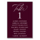 Elegant white calligraphy "table", with guest names listed and table number, wedding table number seating chart card. Background colour shown in plum purple, can be customised.