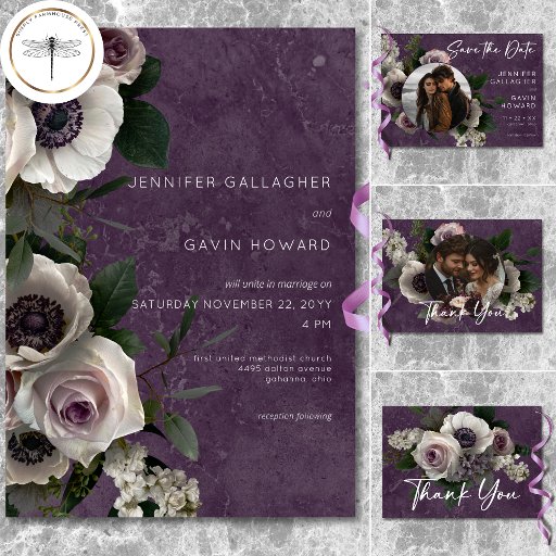 This exquisite wedding invitation design features a captivating spray of pale lavender, white, green, and pale pink anemones and roses, artfully arranged against a luxurious dark plum purple background with a soft marbleised effect. The clean, modern white typography adds a touch of elegance, making this invitation the perfect choice for a romantic and sophisticated wedding. Created by Simply Farmhouse Press.