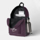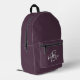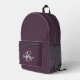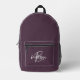 This personalised backpack features a monogram and first name in modern grey and white script on a stylish purple background.