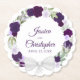 These beautiful coasters will add the perfect festive touch to your wedding reception. They feature a beautiful hand painted watercolor design with a floral wreath in shades of purple, violet, lavender, and plum. The roses and flowers are surrounded by sprigs of eucalyptus leaves and greenery with a beautiful white bow at the bottom. The elegant yet simple boho chic design includes the names of the couple in fancy script lettering as well as the wedding date.