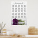 This beautiful 25 table wedding seating chart includes table assignments for 250 guests at the traditional 10 seats per table. The design is romantic and elegant with a single long-stemmed plum purple or eggplant coloured rose reflecting in a pool of water with waves and ripples. The title reads: Please find your table, and is written in fancy script calligraphy. There is space for the names of the couple and the wedding date below. Wonderful way to help your guests find their seats while adding a touch of elegance to your wedding reception.