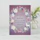 This enchanting design features a circular arrangement of delicate blossoms in shades of plum, rose, and icy blue, intertwined with frosted greenery and berries. A whimsical small creature adds a touch of fairytale magic to the scene, creating a romantic and ethereal atmosphere.