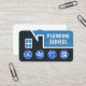 Cover features a white building frame with a leaking water wave design; Here lies your business name "PLUMBING SERVICE" which you can change. At the base of the card is an array of plumbing icon tools.