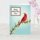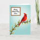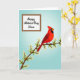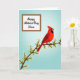 This card shows a bright red songbird perched on a brown branch that angles across the lower middle, surrounded by small white blossoms with yellow centres that feel like a gentle offering ❤️. The bird’s dark face marking and watchful eye add contrast, as if it’s pausing to admire someone nearby in a quiet, affectionate moment. A soft blue gradient fills the background, giving the scene open, airy space like a calm spring morning. In the upper-left area, a white rectangular panel holds the message, set neatly away from the bird so the art still leads the eye. The lettering is flowing and elegant, printed in a dark ink that stands out clearly against the white panel. The balance between the cool sky tones and the warm red feathers creates a tender, friendly push-and-pull, like two people leaning in with unspoken care 🌼. The blossoms cluster along the branch in small groups, each petal outlined gently against the blue backdrop.