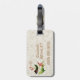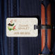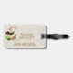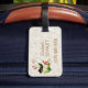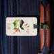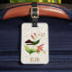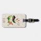 Personalised luggage tag with a vintage illustration of a Bronze-tailed Plumeleteer hummingbird - a bright green hummingbird with rich brown tail feathers perched on a tropical plant with vibrant coral pink flowers, on a light gold marble texture background.