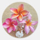 Beautiful photo by Trevor Star of plumeria - the Hawaiian flower - and shells on sandy beach.  Very nice sticker.