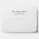 Plumeria flowers and gold flourish decorated envelopes for weddings and events. Light grey, linen paper is blank on the front except for a gold, leafy flourish along the left edge. The flap contains pretty white and yellow frangipani, or plumeria, flowers and a matching, smaller flourish. Include a return address on the flap with modern, handwritten script for names and printed text for address.