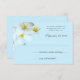 Hawaiian plumeria flower wedding invitation reply cards. Light blue with white flowers and dark gray template text.