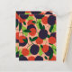Fresh juicy pattern featuring illustrated plums and cherries with green leaves scattered on pink background.