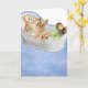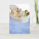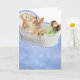 This is a Gender Neutral greeting card featuring an addorable display of plush toy animals all nestled in a white wicker moses basket! Wonderful design for baby announcement, or baby shower invitation.