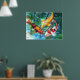 Three brilliant koi swim in a pond reflecting the brilliant blue November sky. Poster from an original watercolor painting by Patricia Allingham Carlson.