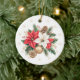 Elegant Christmas ornament. This design features a watercolor illustration of red and creamy-white Poinsettias, holly, pine twigs and pine cones. On the reverse side - add your family photo.