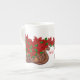 Bone China mug adorned with a poinsettia sled. The sled is designed with wood grain woodwork which is a great vessel to fill with deep red Poinsettias. It will grace your table settings after dinner to serve your hot beverages of choice with deserts. Great for gift giving too.