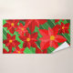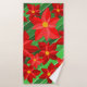 This towel set has a light green washcloth, a darker green hand towel, and a bath towel with a Christmas design of poinsettias scattered around on a field of green stripes.