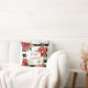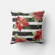 Black and white striped "Happy Holidays" pillow with red, ivory and green poinsettias with green foliage and pinecones to decorate your home for the holidays.
