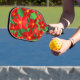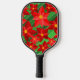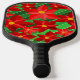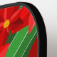 This pickleball paddle has a Christmas design of poinsettias scattered around on a field of green stripes.