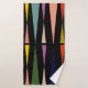This towel set has a bath towel with a mid-century modern design of triangles facing each other repeating across the design, a yellow washcloth, and a purple hand towel.