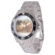Has heft and feel of expensive stainless steel quartz watches. Good band with safety catch. I removed links, which is easy because engraved arrows show direction to push the linking pins. As always by this seller, the image (a railroad logo) is a perfect reproduction of my emailed image, and is precisely spaced and aligned.