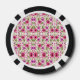 Poker chips with a vibrant pink floral pattern set against a white background. Bold black and white segments circle the edges, creating a striking contrast.