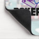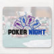 A mouse pad with poker night typography. Background with a faint image with poker chips and playing cards on a green gaming table. Layered over top is a set of 4 cards with boy and girl silhouettes.