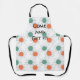 This apron has a mid-century modern design of circles with lines behind in orange and green.