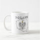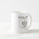 Simple design with a map outline of Poland with the Polish White Eagle, the coat of arms or crest of Poland in the centre. The word Poland is above the map.