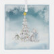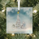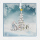 Lovely glass Christmas ornament depicts a sitting polar bear wearing a winter cap and scarf as he stares at his snowman across a lighted Christmas tree in the snow.