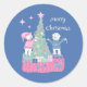 Cute Holiday blue round sticker featuring two young polar bears decorating a Christmas tree . Personalise it with your text . This design is also available in a cream colour .