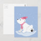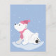 A baby polar bear wearing a scarf and winter hat watches the snowflakes fall. This design can be customised or personalised. It is available on multiple products including t-shirts, pillows, cards, and coffee mugs.