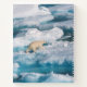 This photo features a polar bear on colourful, heavy ice floating in water.