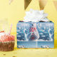 A polar bear wearing a red and white striped scarf stands on an icy landscape forming a heart shape with its paws