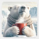A content polar bear enjoys a steaming cup of hot beverage wrapped in a cosy scarf surrounded by a vast icy landscape.